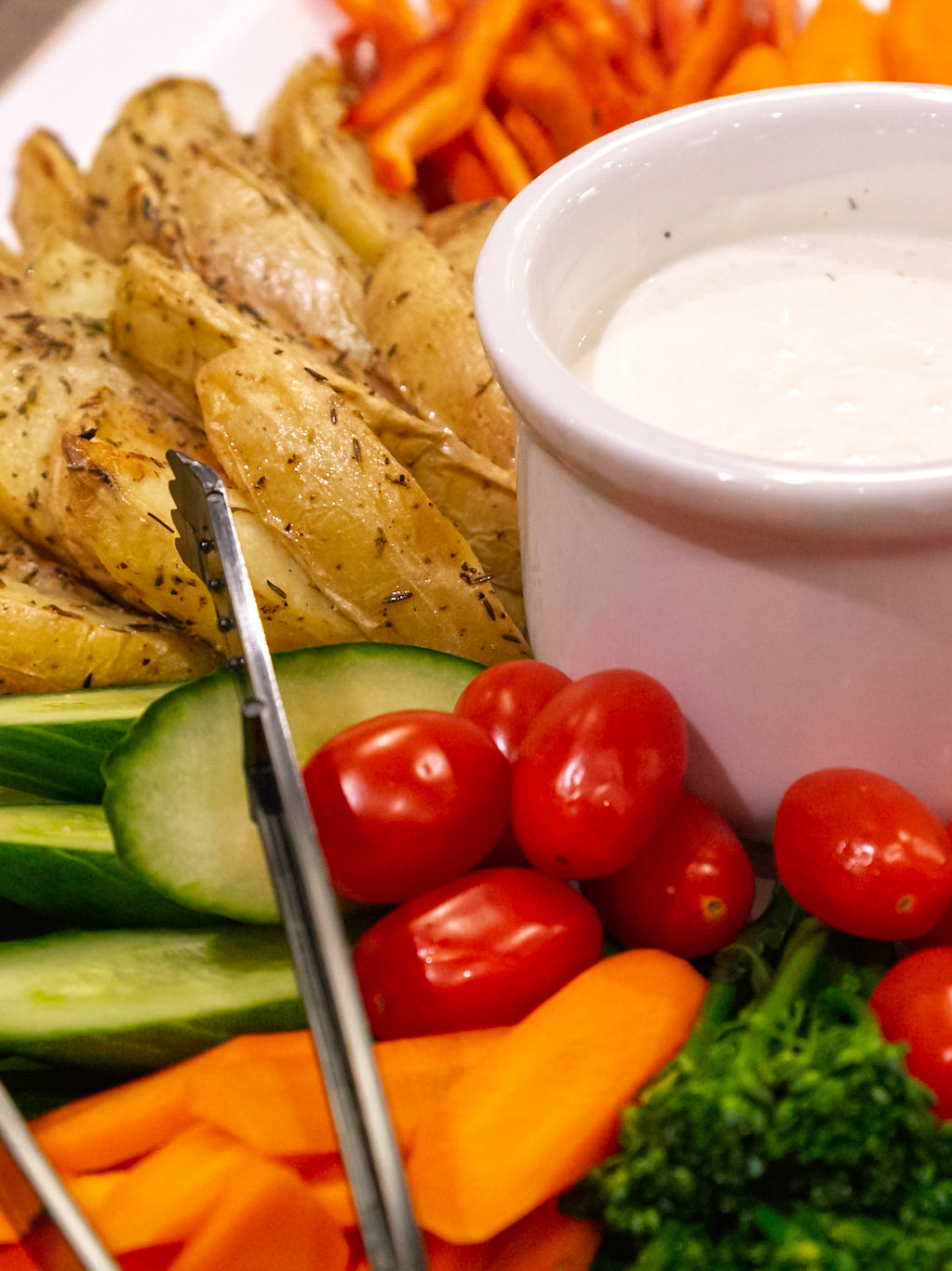Fog Lark, Portland, Oregon - March 15th 2019: A salad with greens, tomatoes, and a garlic clove shaped like a duck is presented.